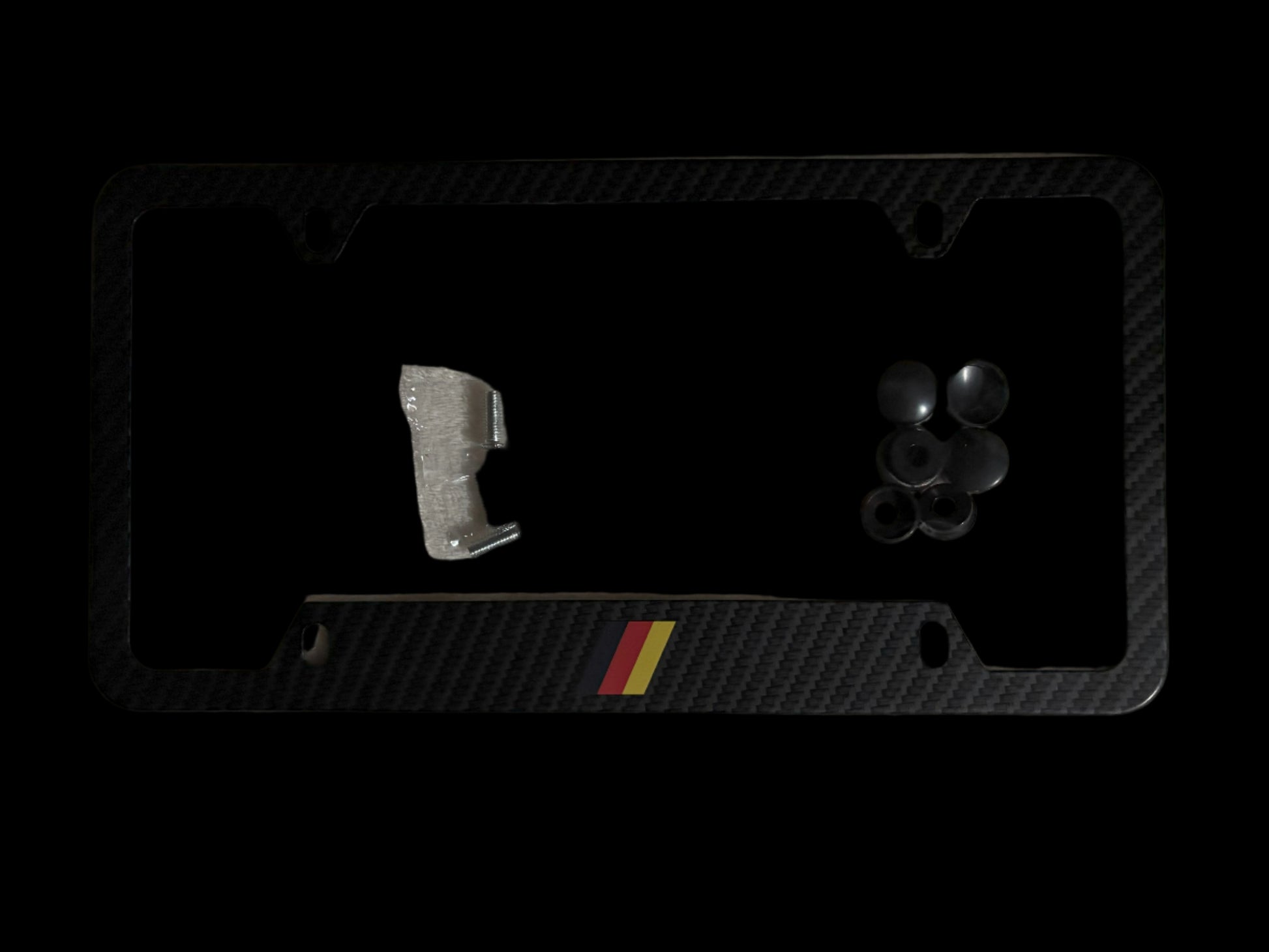 Bayern Motor Werks Carbon Fiber Style Black Metal License Plate Frame with German Flag colors emblem. Comes complete with mounting screws and screw caps. Fits US model Audi's front or rear with US state license plate backing holder. Fits most domestic and foreign manufactured motor vehicles sold in the United States in compliance with NHTSA Standards. One plate frame per package.